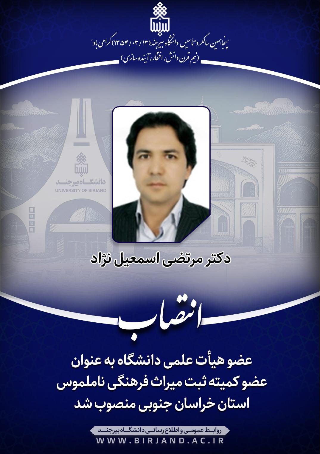 علی دارابی، قائم مقام وزیر و معاون وزارت میراث فرهنگی، گردشگری و صنایع دستی، طی ابلاغی دکتر مرتضی اسمعیل نژاد، عضو هیأت علمی گروه آموزشی جغرافیا دانشگاه بیرجند را به عنوان عضو کمیته ثبت میراث فرهنگی ناملموس استان خراسان جنوبی به مدت دوسال منصوب کرد.