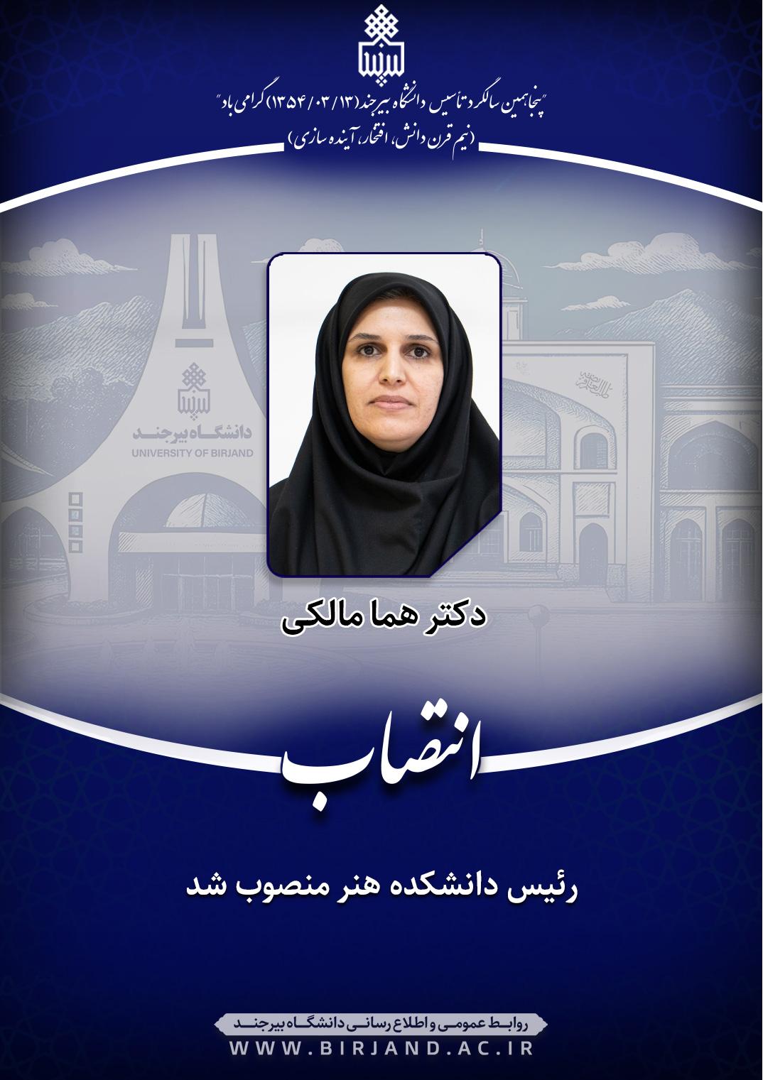 به گزارش روابط عمومی و اطلاعرسانی دانشگاه بیرجند، در ابلاغ انتصاب صادره از سوی دکتر خامسان به دکتر مالکی آمده است؛ نظر به مراتب تعهد، تجارب و شایستگیهای علمی و اجرایی سرکارعالی، به موجب این ابلاغ و با حفظ سمت آموزشی و پژوهشی، به سمت «رئیس دانشکده هنر» به مدت دوسال منصوب میشوید. اطمینان دارم با اتکال به خداوند سبحان و بهرهگیری از مشارکت و همفکری همکاران دانشگاهی، منشاء خدمات ارزندهای در این حوزه خواهید بود.