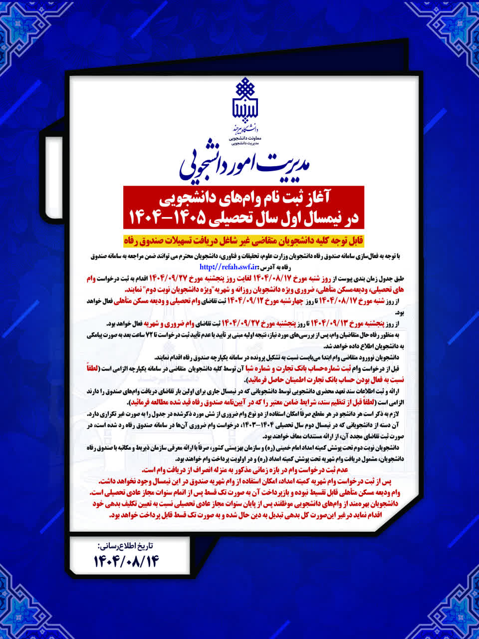 زمان شروع: طبق جدول زمان بندی اعلام شده از روز شنبه 1404/08/17 تاروز پنج شنبه مورخ 1404/09/27 اقدام به ثبت درخواست وام های تحصیلی، ودیعه مسکن متآهلی ،ضروری ویژه دانشجویان روزانه وشهریه "ویژه دانشجویان نوبت دوم" نمایند.
