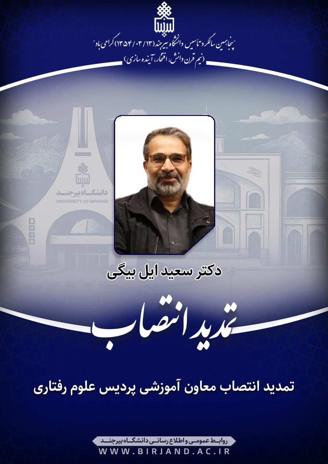 به گزارش روابط عمومی و اطلاع‌رسانی دانشگاه بیرجند، در این ابلاغ انتصاب آمده است؛ نظر به مراتب تعهد، تجارب و شایستگی‌های علمی و اجرایی جنابعالی، به موجب این ابلاغ و با حفظ سمت آموزشی و پژوهشی، انتصاب شما به سـمت معاون آموزشی پردیس علوم رفتاری، به مدت دو سال تمدید می‌شود. مقتضی است ضمن مطالعه دقیق سند چشم‌انداز و برنامه 5 ساله دانشگاه و دانشکده، در خصوص نظارت بر حسن اجرای آیین‌نامه‌ جامع مدیریت دانشـگاه‌ها و موسسات آموزش عالی، پژوهشـی و فناوری، رئوس انتظارات دانشـگاه (بر اساس شـرح وظایف سازمانی، مصوبات هیأت نظارت، ارزیابی و تضـمین کیفیت و سـند چشم‌انداز)، دستورالعمل میزان و نحوه حضور و فعالیت اعضای هیأت علمی دانشگاه در طرح‌های تمام وقت عادی و ویژه  اقدام لازم به عمل آورید.