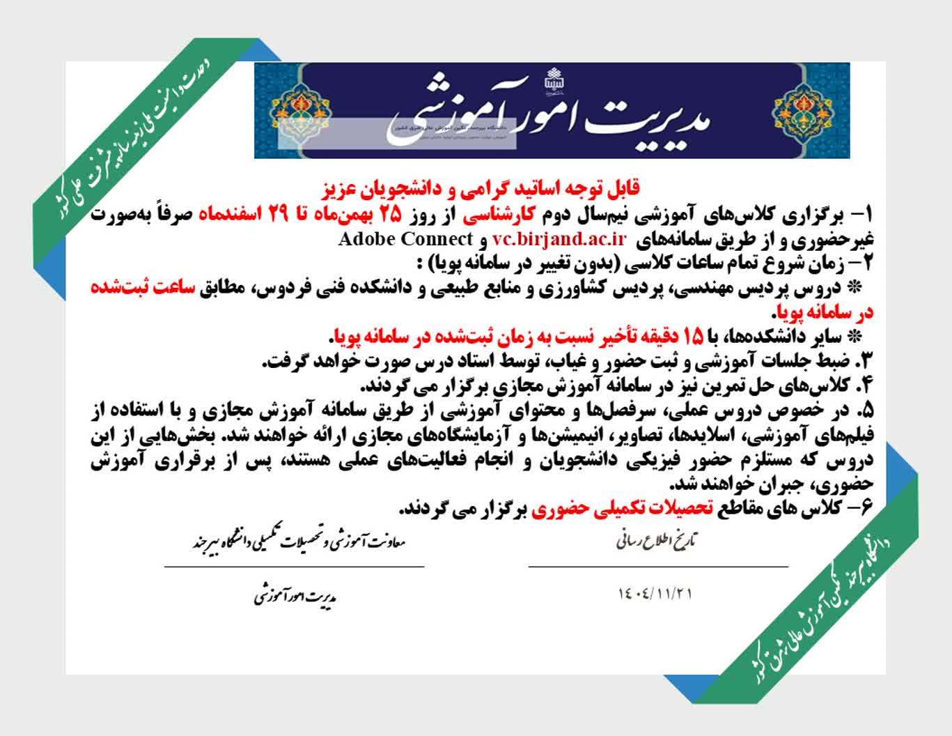 اطلاعیه آموزشی برگزاری کلاس‌های آموزشی نیمسال دوم کارشناسی بصورت غیرحضوری